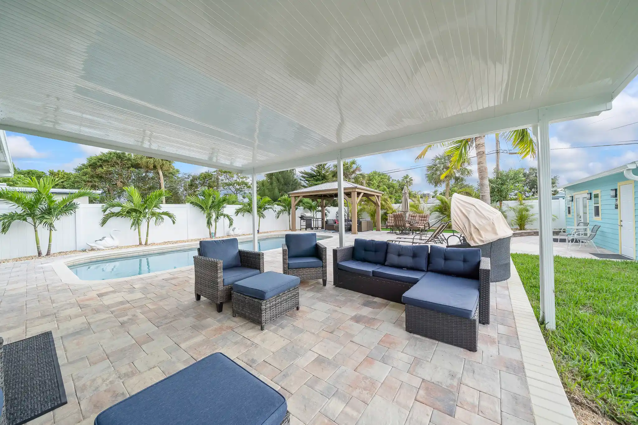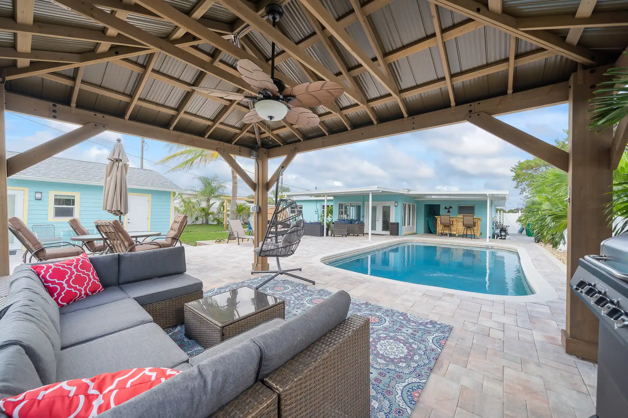 Located just 1 block from the beach and close to Port Canaveral and the Cocoa Beach Pier. Updated house with large heated pool, covered gazebo with grill/cooking area, fire pit, bar and plenty of outdoor seating. Full game room with pool table, ping pong, shuffle board, separate kitchen/bathroom etc. Inside is all new furniture, appliances, granite countertops and smart TV’s in every room. Plenty of room to comfortably sleep 10+ people, beach cruiser bikes and all beach gear to walk to beach